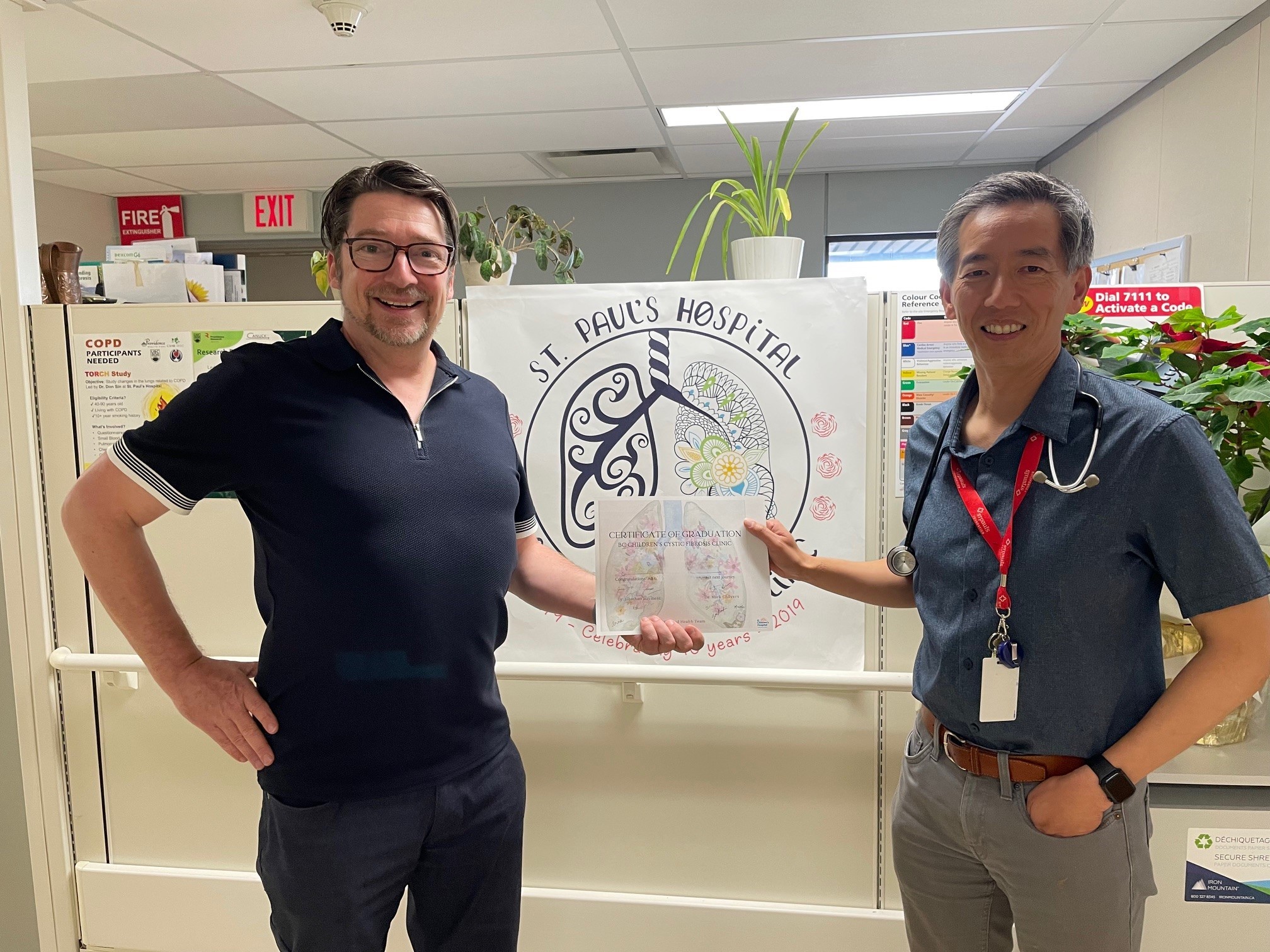 Dr. Chilvers (left) and Dr. Bradley Quon (right), director, St. Paul’s Hospital CF Clinic holding a CF grad clinic certificate.