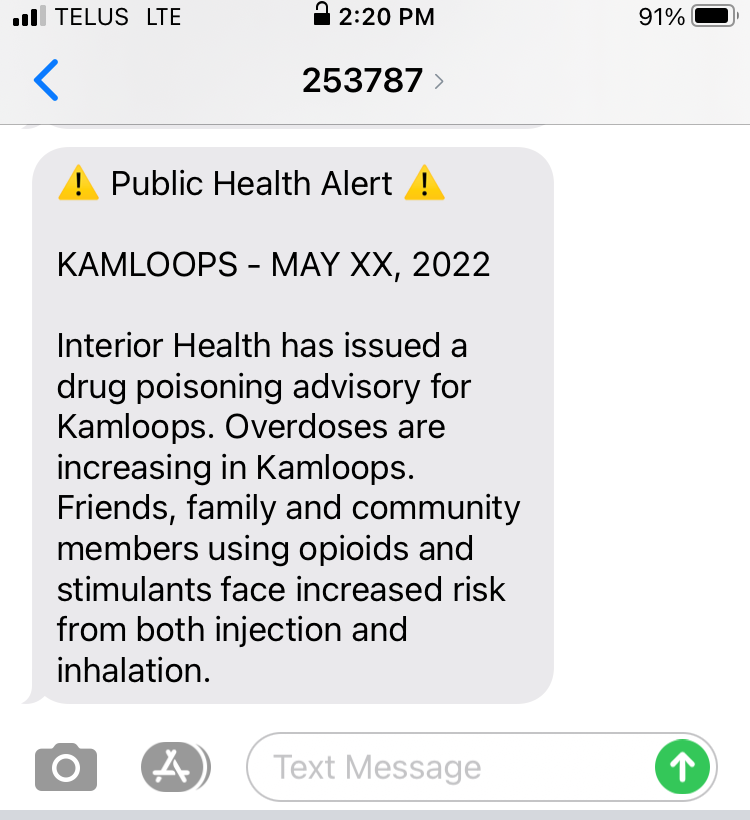 People in Interior Health now have access to a text-based service for toxic drug and health alerts. The service will use clinical digital messaging (text messaging) to send alerts aimed to prevent drug poisonings, deaths, and provide public health information to people who use drugs (PWUD), as well as community members.