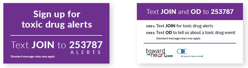 The Harm Reduction Team at BCCDC has created public-facing promotional materials for the Toxic Drug and Health Alerts initiative. These include posters and wallet cards that will be distributed by community and organizational partners in registered harm reduction sites, overdose prevention sites, community organizations, and health centres.